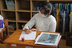 今日は絵画の彩色を行いました。そして今回は、彩色に絵の具が登場です。絵の具は2色までという条件のもと行いました。クレヨンで彩色したところと素敵にマッチングした作品に仕上がっていました。