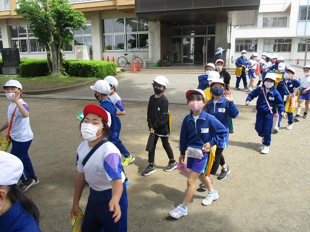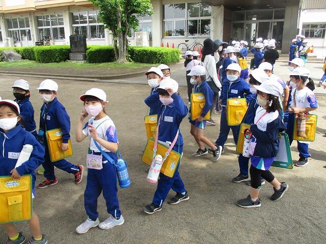 1、2年生は、学校周辺道路を使って歩行練習をしました。また、4年生は、校庭での模擬道路を使って自転車の実技練習をしました。