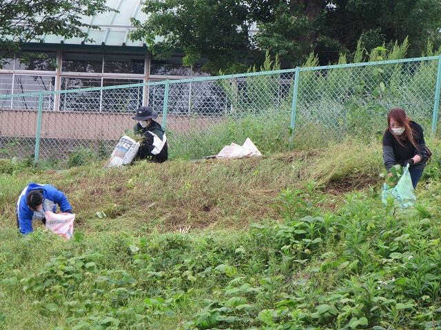 アカマツ林坂付近や校舎西側の土手を中心に、PTA総務委員、環境整備委員、教職員が分担し約1時間半の作業を行いました。朝早くからご協力いただいた保護者の皆様、大変ありがとうございました。