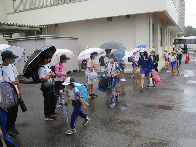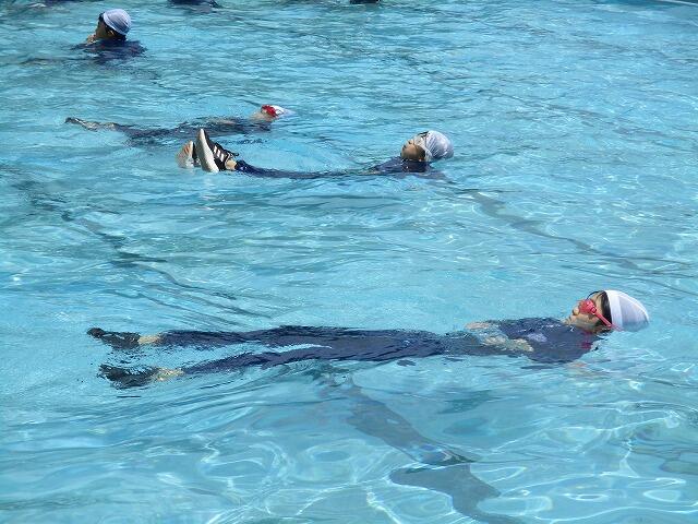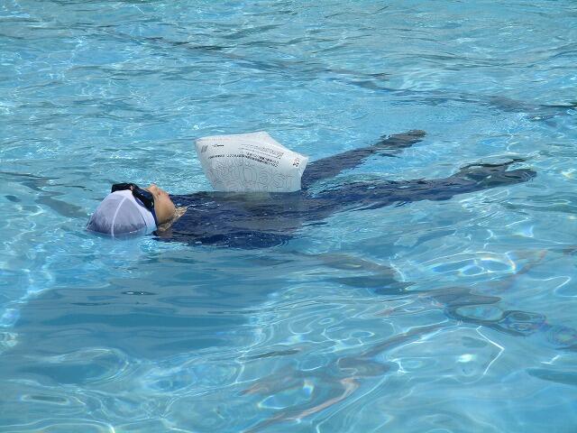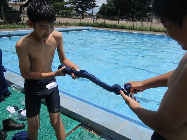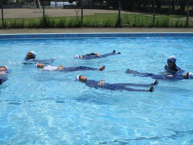 本校では、水泳の授業の中で着衣水泳の授業を1時間設定しております。ねらいは、着衣のまま水に落ちた時の安全確保や簡単な救助の方法を自ら体験して身に付けること、また。身近なものを使って浮いたり、着衣のまま浮く方法を身に付けるためです。6年生が自らその体験をし、対処の仕方を学びました。