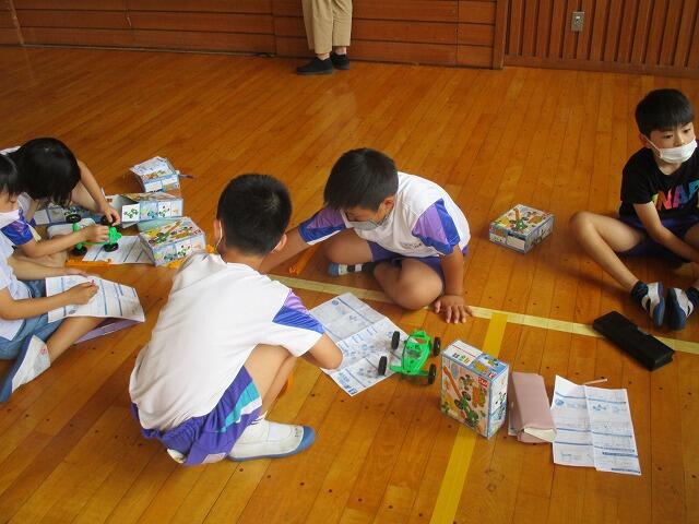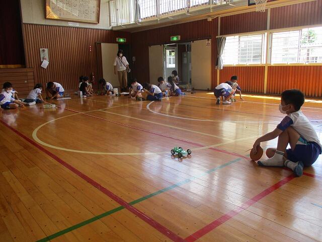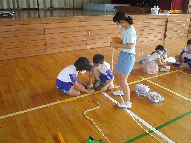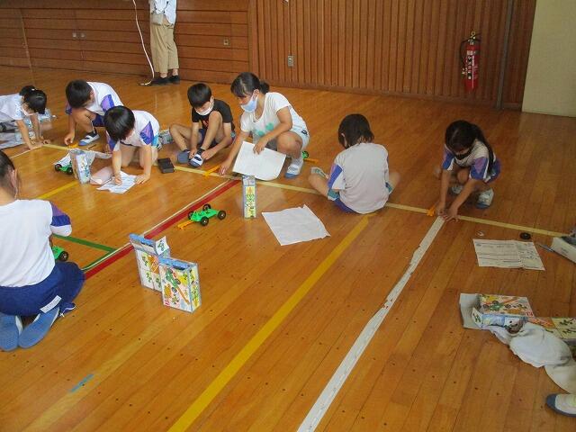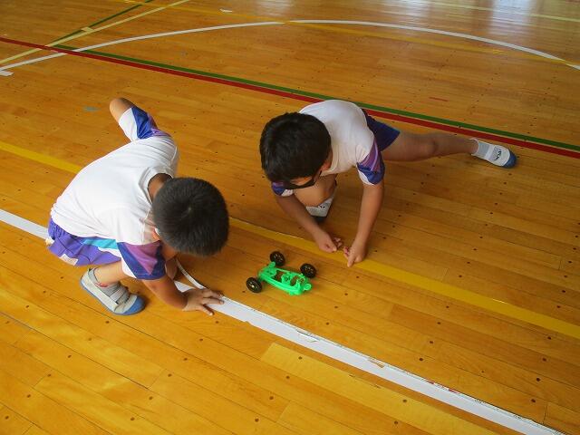 2校時、3年生は理科の実験を体育館で行っていました。ゴムのはたらき(本数)によって車の進む距離を班で協力して測定していました。
