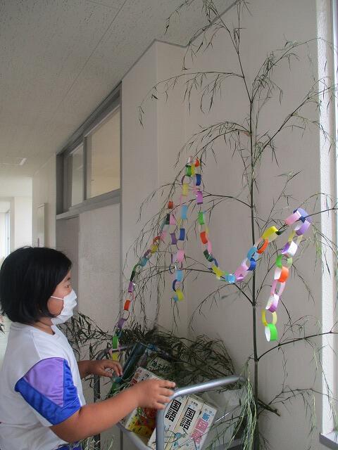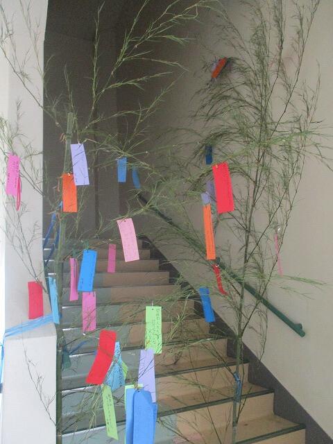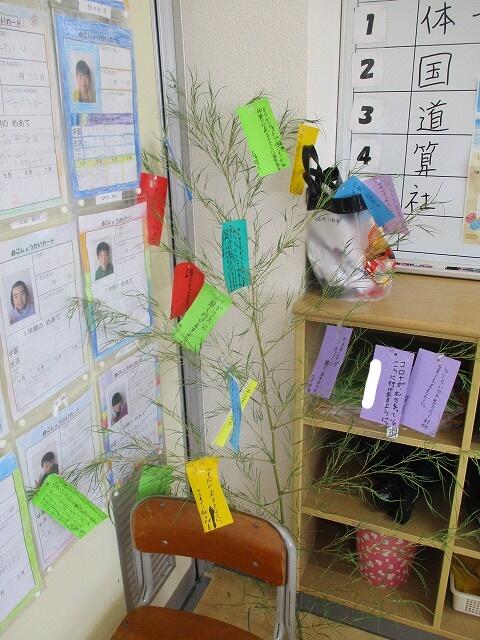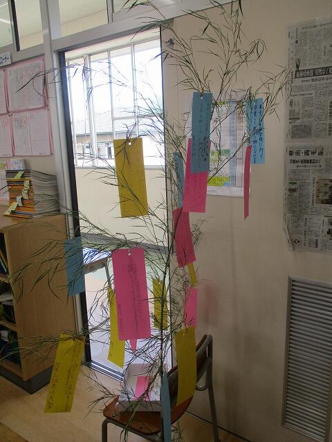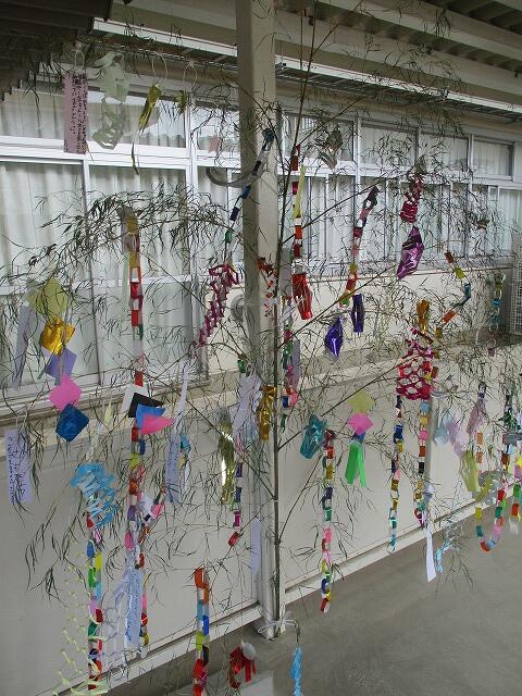 今日は、七夕です。廊下や教室には、学校内の竹を切って来て、願い事を書いた短冊を飾っていました。