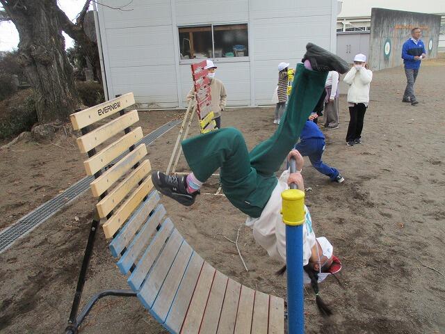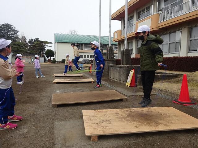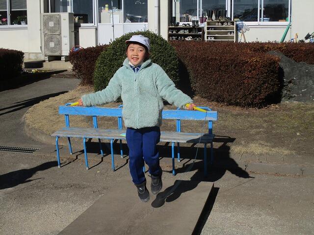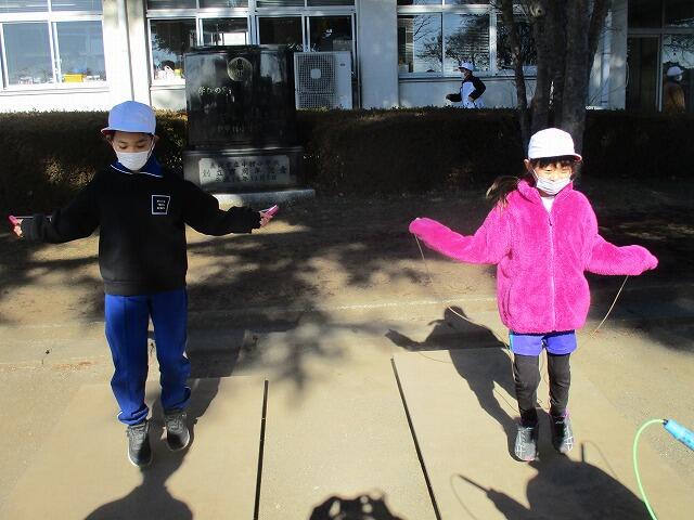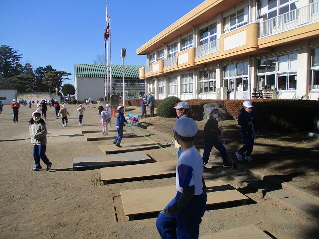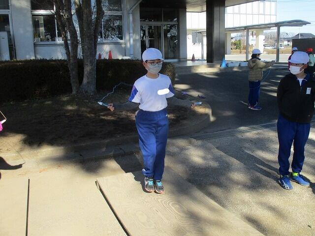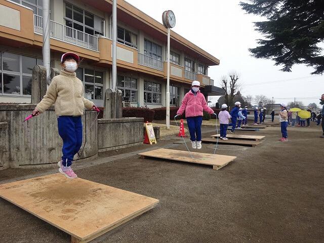 3学期は、なわとびを中心に体力向上を実施していきます。本日は、早速、なわとび練習版(ジャンピングボード)を使って練習する児童が見られました。
