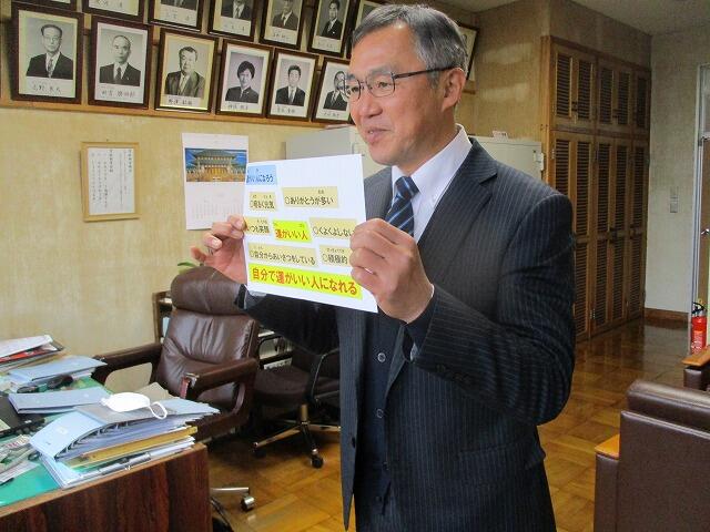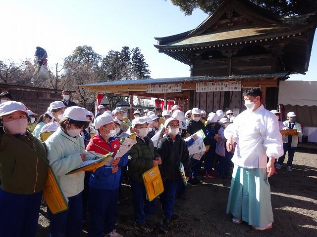 その後、校長先生よりお話をいただきました。干支についてのお話の後、「運がいい人になろう」という内容で、だれにでも運がいい人になれるが、そのためには①明るく元気②くよくよしない③自分からあいさつ④積極的に行動⑤ありがとうが多い⑥いつも笑顔 などを心がけることが大切になると優しく語りかけていました。