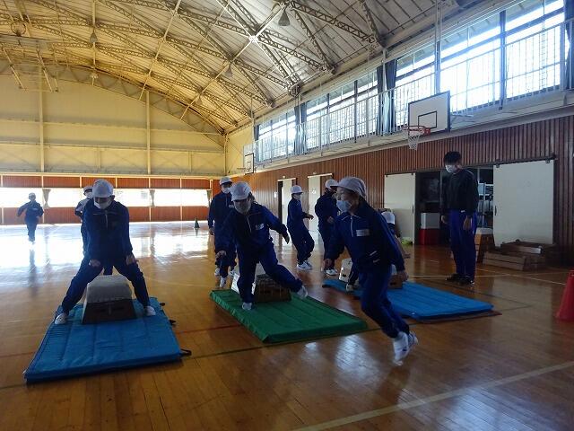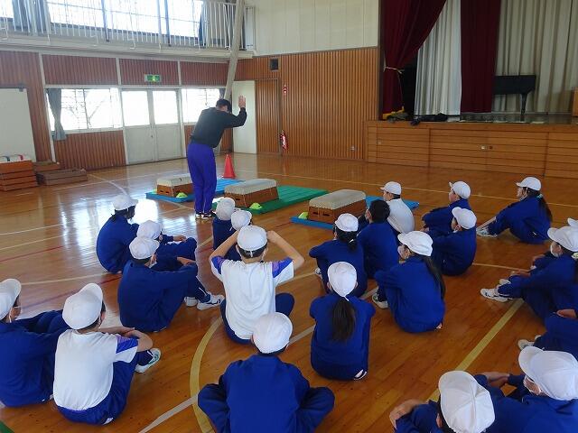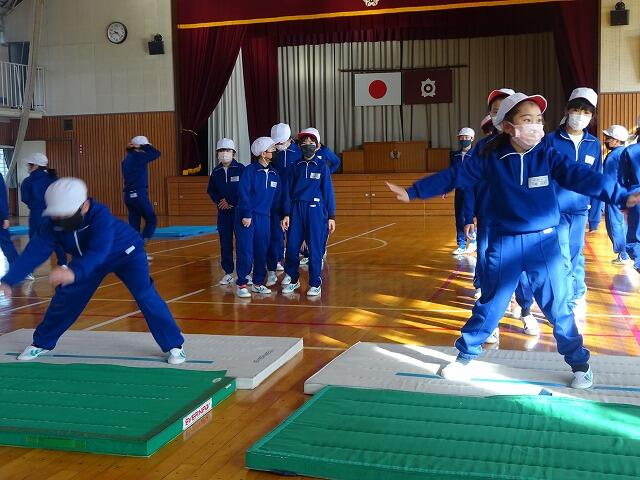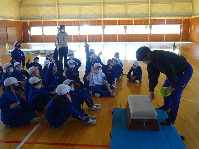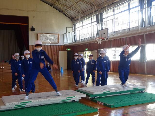 開脚跳びの導入として形つくり、開脚跳びの一連の動作を体験、意識付けをすることをねらいとし、児童は、安全面に注意しながら、笑顔で活動していました。