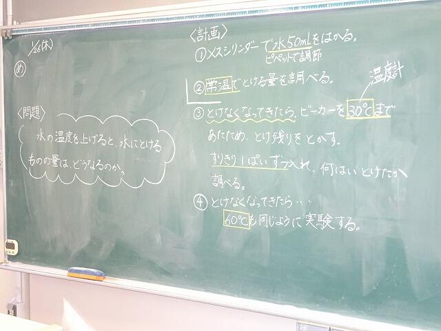 今日は、5年生が理科の実験をしていました。温度による水にとけるものの量の変化について、実験を通して検証していました。今日も、科学教育センターの指導主事の方に授業を参加していただきました。