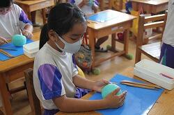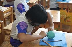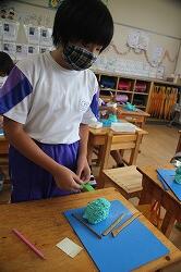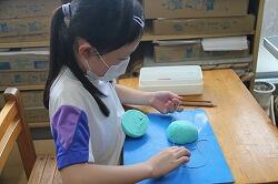 3年の図工は造形で、粘土工作を行いました。最初に丸い形を作り、切ったり、かき出したりしながら新しい形を作っていこうという学習です。模様をつけるために、へらだけではなく、はさみで細かい模様や糸状の変化をつけるなど、工夫した作品が出来上がりました。