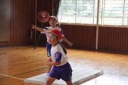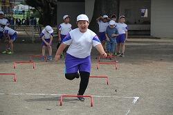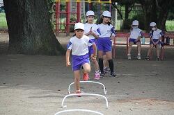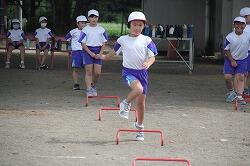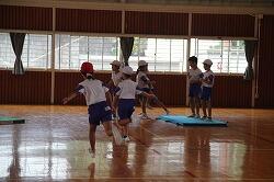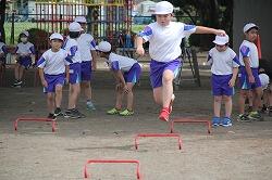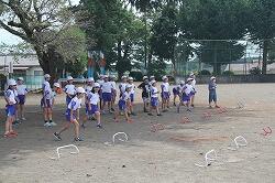 体育は「走」の運動を行いました。等間隔に置いたラダーをリズムよく跳び越して走っていきます。そのためには、ラダーの間を何歩でいくか決めなくてはなりません。同じように跳び越していけるように練習を重ねました。