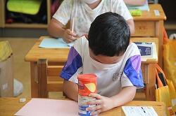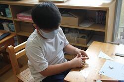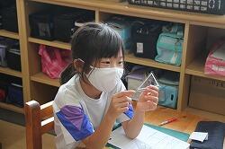 算数は「かたちあそび」の単元です。ここでは、いろいろな形、そして立体について目で見て、触って体験していく学習を行います。今日は、家から持ってきたいろいろな立体の面を紙に描きました。改めていろいろな形があることを実感していきました。
