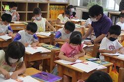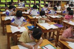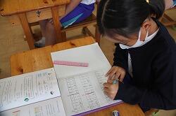 3年の算数では「万の位」の学習をしています。今日は、漢字で記された8桁の数を書く学習をしました。「〇千◎百▽十▽万◇千◆百□十■」という問題が出されたら、万の後ろに線を引いて、万の世界との区別を付けます。そして数字に表記していきますが、子どもたちが苦労するのは「〇千▽十▽万」と百万の位がなかったときは「0」に置き換えること、「〇千百▽十▽万」といきなり百ときたときは「1」に置き換えることです。練習を重ねながらマスターさせていきます。