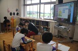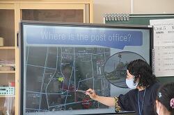 電子黒板には、学校周辺の航空写真が映し出され道を確認。AETに、まっすぐ進む言い方、左右に曲がる言い方、どのくらい進むかの言い方を教わり、体を動かしながら試していきました。