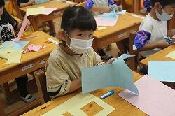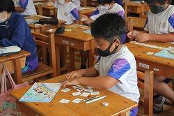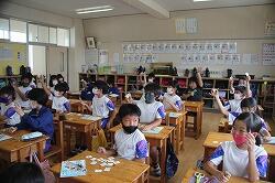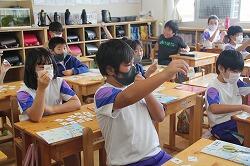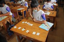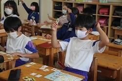 各自、文房具の描いてあるカードを切り取り、AETから「校長先生の持っているものは?」「〇〇先生の持っているものは?」と。そして、英語で文房具の名前を言われ、考えながらカードを提示していきました。文房具の英単語に慣れてくると担任から「数も入れてみよう」と。6冊のノートだったら「six notebook」「ちがうよ、sをつけるんだよ」などと意見が交換されていくことで、学びが深まっていきました。