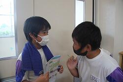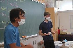 教科書に出てくる一日の生活の流れを自分の生活にあてはめ、ふろに入る時刻などを記入していきました。担任から、「それだけでは面白くないから、夕飯だったら何が好きかな?布団でねるかな?ベットで寝るかな?そんなことも説明しよう」とあり、子どもたちの気分が盛り上がってきました。そして、担任とAETによる模擬会話。夕飯の時刻を聞かれた担任は、時刻を答えた後、「I like アユの塩焼き」と発言。子どもたちは大爆笑でしたが、やる気満々。会話タイムとなり、相手に自分の生活タイムを懸命に伝えました。