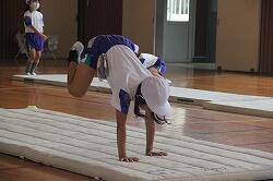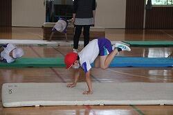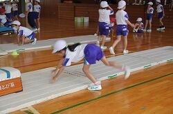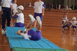 今日は「マットを使った運動遊び」を行いました。4つのコースを作り、手をついて足を上げたり、転がったり、回転したりと、いろいろな動きを練習しました。