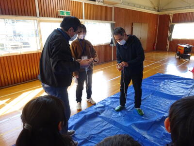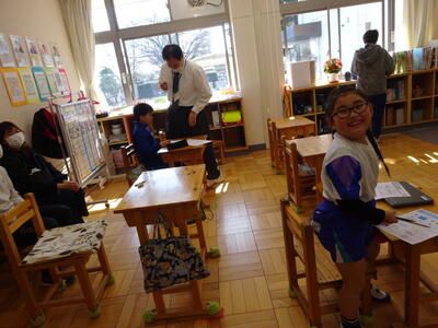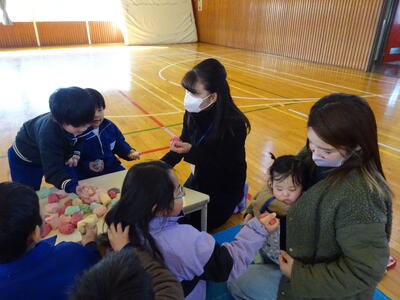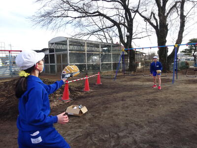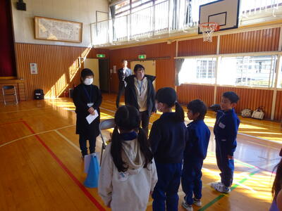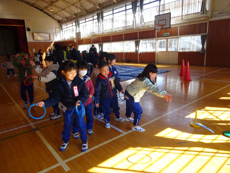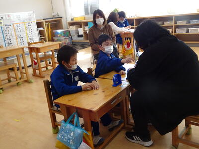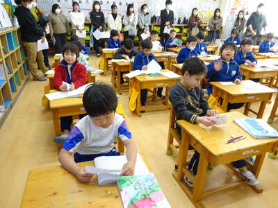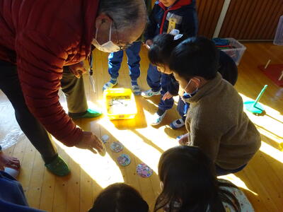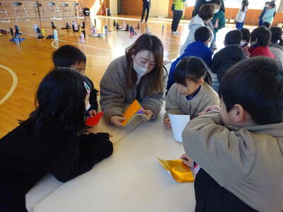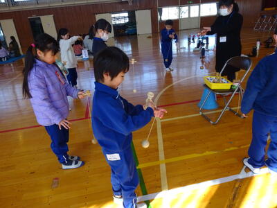 ボランティアの方々に来ていただき、昔あそびを教えていただきました。歌を歌ってお迎えした後、けん玉、めんこ、輪投げ、コマ回し、折り紙、お手玉などいろいろな体験をしました。みなさんに優しく丁寧に教えていただきました。