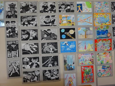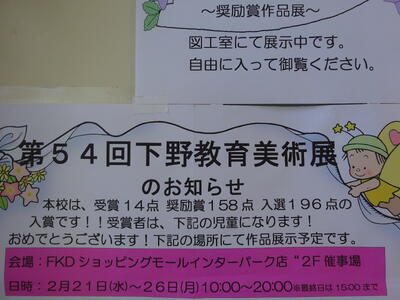 奨励賞158点の奨励賞が図工室に飾ってあります。1年間ですばらしい作品がたくさん出来上がりました。一度覗いてみてください。銅賞以上の受賞された作品の14点は、FKDショッピングモールインターパーク店に飾られる予定(21日~26日)です。