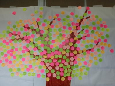 先日、3年生を送る会で、3年生から提案があった感謝の木です。感謝の花が、見事に満開になりました。