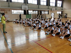 3回目の冬期体力づくりです。今回は、鬼ごっこ(バナナ鬼)をやりました。鬼に触られるとバナナになり、両手を上にあげて止まります。味方が助けに来ると、1回目のタッチで、片手を下げられ、2回目で元に戻ることができます。ビブスを付けた体力自慢の鬼たちに追われ、多くのバナナが誕生しました。しかし、仲間思いの友人が助け、バナナが増えたり減ったり、最後は鬼も体力的にきつくなったようでした。