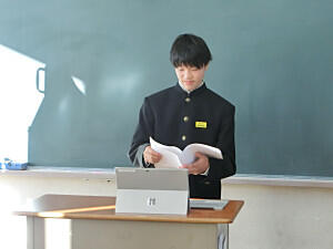 9日に行われる生徒会役員選挙のお昼の演説が行われました。給食の時間に理科室からリモート配信して行いました。今日は、1年生副会長候補の2人の発表でした。