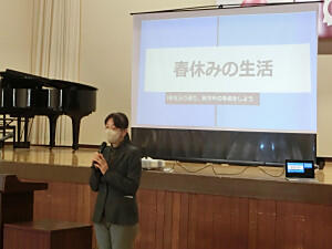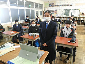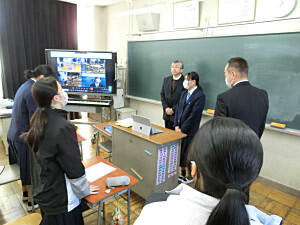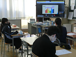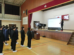 本日の朝会は、校長講話をリモートで行いました。今回は、現在、海外交流しているオーストラリアについて、英語で説明しました。オーストラリアの英語の質問に、生徒たちもしっかり答えることができました。その後は、学校評価アンケートで、生徒からいくつかの質問があったので、生徒指導主任より対応についての話がありました。