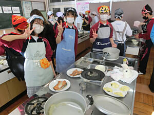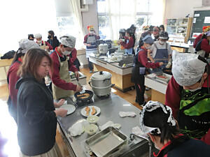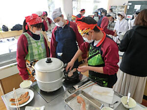 3,4校時に1年生の調理実習を行いました。今回も調理ボランティアの方にお手伝いいただきました。生徒の皆さんも、調理しながら片づけをしたり、次の準備をしたりと手際よく行っていました。おいしい肉じゃがとほうれん草の胡麻和えが完成しました。
