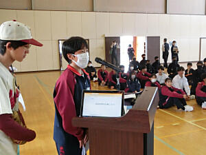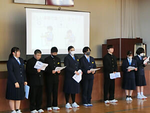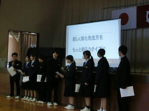 福祉委員会による朝会が行われました。今回は、福祉に関するクイズが行われました。生徒の皆さんは、正解が多く福祉に関心が高いことがわかりました。
