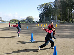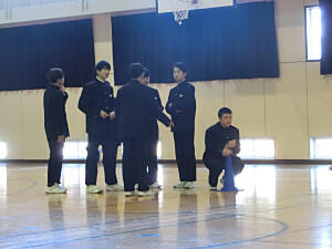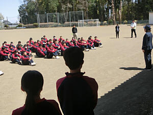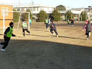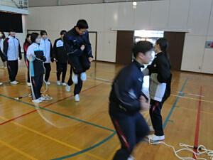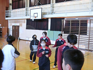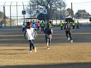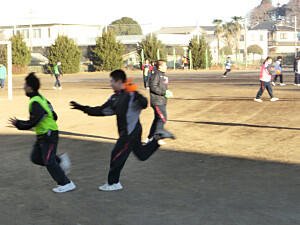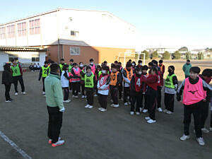 3回目の冬期体力づくりです。今回は、鬼ごっこ(バナナ鬼)をやりました。鬼に触られるとバナナになり、両手を上にあげて止まります。味方が助けに来ると、1回目のタッチで、片手を下げられ、2回目で元に戻ることができます。ビブスを付けた体力自慢の鬼たちに追われ、多くのバナナが誕生しました。しかし、仲間思いの友人が助け、バナナが増えたり減ったり、最後は鬼も体力的にきつくなったようでした。