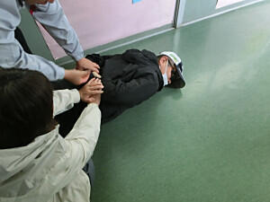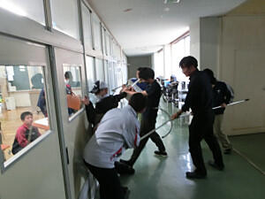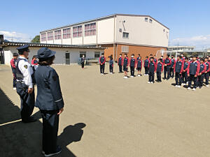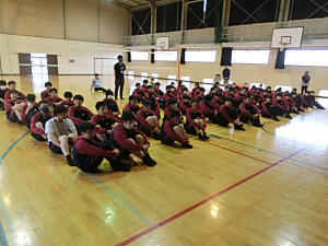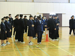 今回の避難訓練は、地震から火災発生を想定した訓練でした。火災発生後に生徒は、服で口をふさぐなどして避難しました。避難後は、起震車体験を行いました。最後に、二宮分署の方からご講話いただきました。