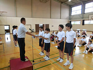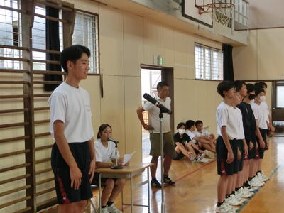 いよいよ明日から夏休みです。「充実した楽しい夏休みにするために」ということで、終業式では、校長先生から3つの話がありました。「早寝、早起き、朝ご飯」、「これまでの復習をする」、「3人の方に絶対にお世話にならない」、その他にも、朝会で話した「自ら課題を設定し、自ら解決する」ということにも挑戦しようと話しました。その後は、クラス代表の作文発表や表彰を行いました。表彰は、陸上競技や剣道、ポスターなど多くの表彰がありました。最後に学習指導主任や生徒指導主事より大切な話があり、生徒も真剣に聞いていました。また2学期始業式に元気な姿を見せてください。皆さん良い夏休みを!