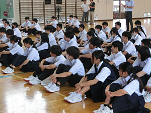 今回の避難訓練は、地震から火災発生を想定した訓練でした。火災発生後に生徒は、服で口をふさぐなどして避難しました。避難後は、起震車体験を行いました。最後に、二宮分署の方からご講話いただきました。