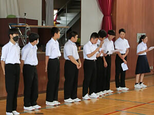 本日は、2学期の表彰を行いました。陸上競技をはじめ、剣道やロボコン、美術関係、教育祭、税、少年の主張、作文関係、音楽関係など多くの賞をいただきました。今回表彰できなかった分は、終業式に行います。皆さんおめでとうございます。