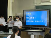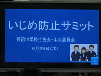 生徒会役員と中央委員が中心となり、いじめ防止サミットが開かれました。事前に各クラスで話し合いをもち、いじめを防止するためのスローガンを考え、発表しました。