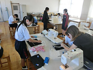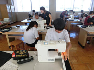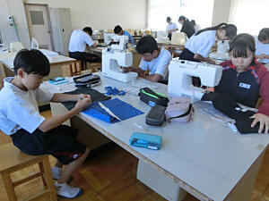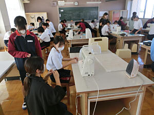2年生の家庭科の授業は、授業ボランティアの2名の保護者にお手伝いに来ていただきました。ティッシュケースの製作の続きで、本日はミシンで縫いました。