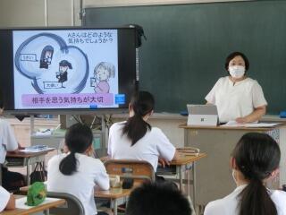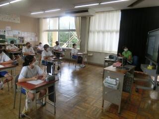 2年生の教室と、1,3年生の教室をリモートで結んで行いました。