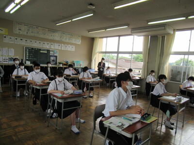 2年生の英語の授業です。機内放送から必要な情報を聞き取るという、