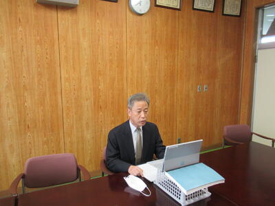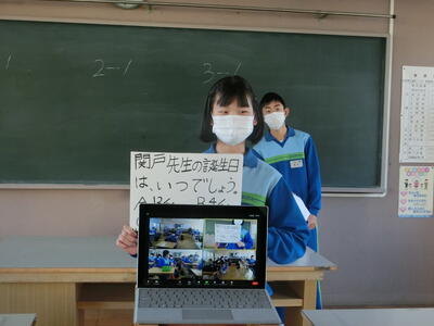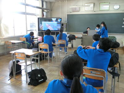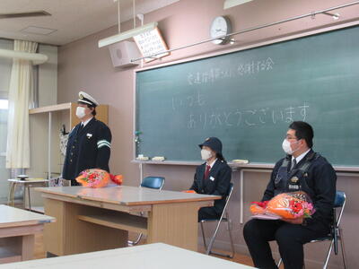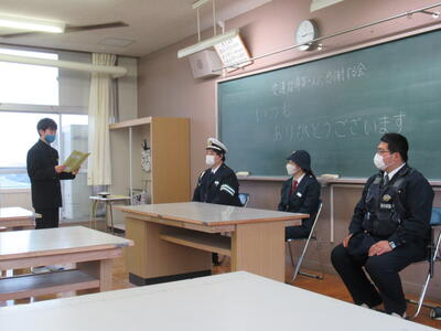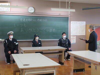 15日、交通指導員さんに感謝する会がリモート配信で小学校と合同で行われました。