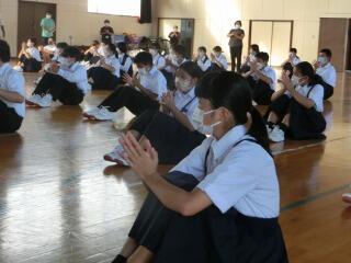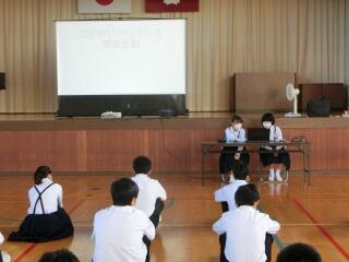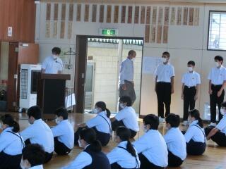 委員会の活動の紹介などを行う、生徒朝会。今月は福祉委員が募金活動などについて発表しました。