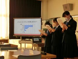 今月の生徒集会は保健委員会の担当。保健委員会が行ったアンケート「中学生の悩みとその解消」についての発表を行いました。