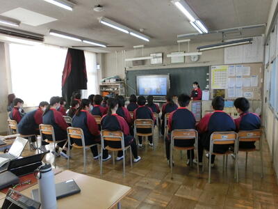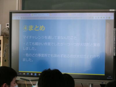2年生が、マイ・チャレンジ活動の様子を発表しました。その発表会では、来年度、活動に参加する1年生が参観し、真剣に発表を視聴していました。