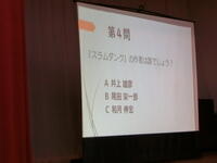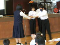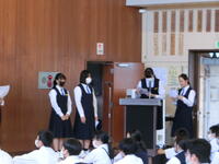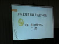 図書委員会による集会が行われました。最初に、今年度の多読賞の生徒が表彰されました。次に、図書室に関するクイズが出され、最後に、司書さんおすすめの本が紹介されました。