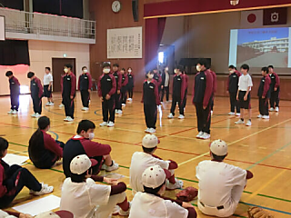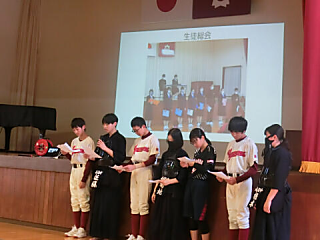 生徒会本部役員からとても分かりやすく、学校行事や学校生活について説明されました。また、各部から工夫を凝らした部活動紹介がありました。1年生にとっては、すべての説明が初めての内容なので、先輩の話を真剣なまなざしで聞き入っていました。新入生代表のあいさつでは、「お互い仲良く、活発に、助け合いながら力を合わせて頑張っていきたい」、最後には「先輩方を見習って、しっかりとした行動ができるようにしたい」と語っていました。