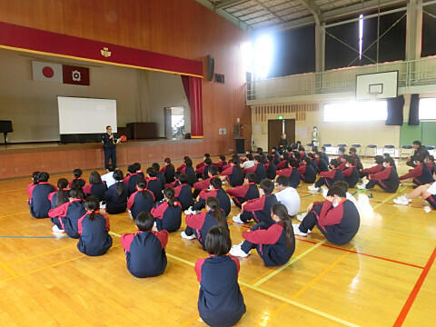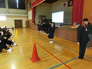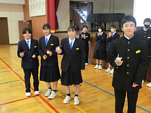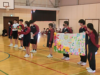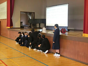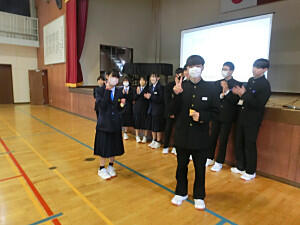 17日(水)の生徒朝会は、元気な朝のあいさつから始まりました。今回は、中央委員によるクイズ大会が行われました。学校施設や先生のことなどたくさんの問題が用意されていて、3択で答えました。たくさん正解した生徒には、校長先生より賞品が送られました。