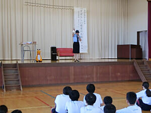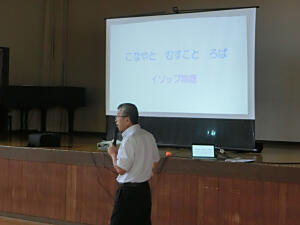 元気なあいさつで始まった本日の朝会は、「この人 だ~れ?」。ヒントは、「1787年生まれ」「出身は小田原」「身長180cm」「体重94kg」「600の農村を復興」「報徳の教え」。そうです、皆さんご存じの二宮尊徳または二宮金次郎です。この人から学ぶということで、「至誠」「勤労」「推譲」の話がありました。そのあとはお楽しみのイソップ物語。今回は「こなやと むすこと ろば」のお話でした。