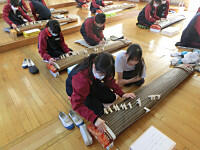 1年生の筝の授業がありました。外部の講師の方に来ていただ、筝についていろいろ学びました。また、演奏の仕方についても学び、実際に演奏しました。はじめは、ぎこちなかった演奏も、後半では、びっくりするくらい上達していました。最後には、全員で「さくらさくら」を演奏しました。