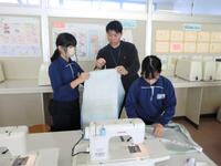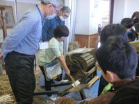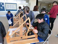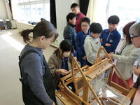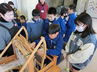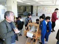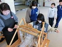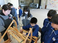 真岡木綿会館から3名の織姫さんが来校し、3台の機織り機で体験させてくださいました。