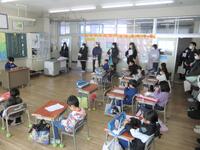 お昼の校内放送で御挨拶をいただき、児童は各教室の自席から一斉に大きな声で