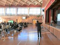 担任だけではもったいない!ということで急遽、全校生を集めて演奏会を行いました。