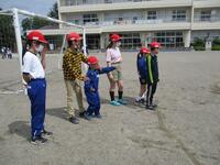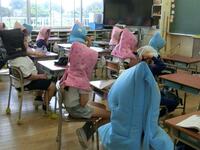 防災頭巾を被るなど、より実践的な方法で真剣に訓練に取り組みました。