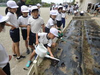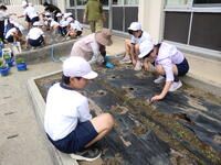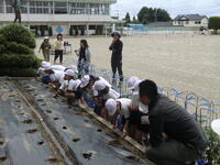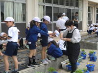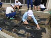 校庭の南の学校農園で、各学年で農園活動を行っています。