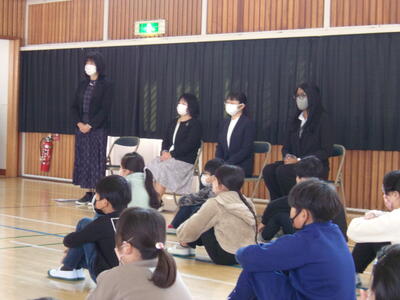 始業式に先立ち、新しく赴任した4名の先生の紹介と担任発表を行いました。担任教員については保護者向けのページをご覧ください。